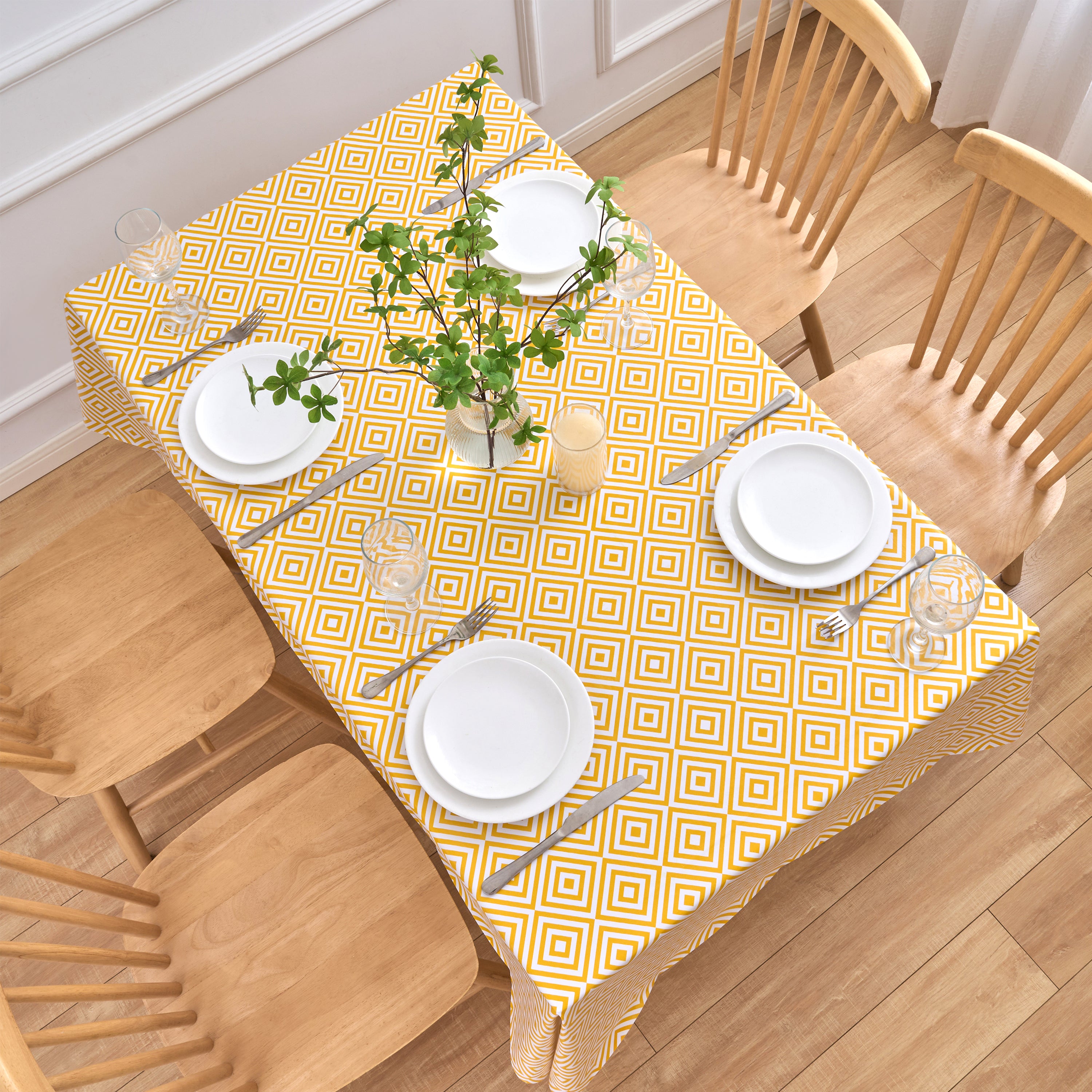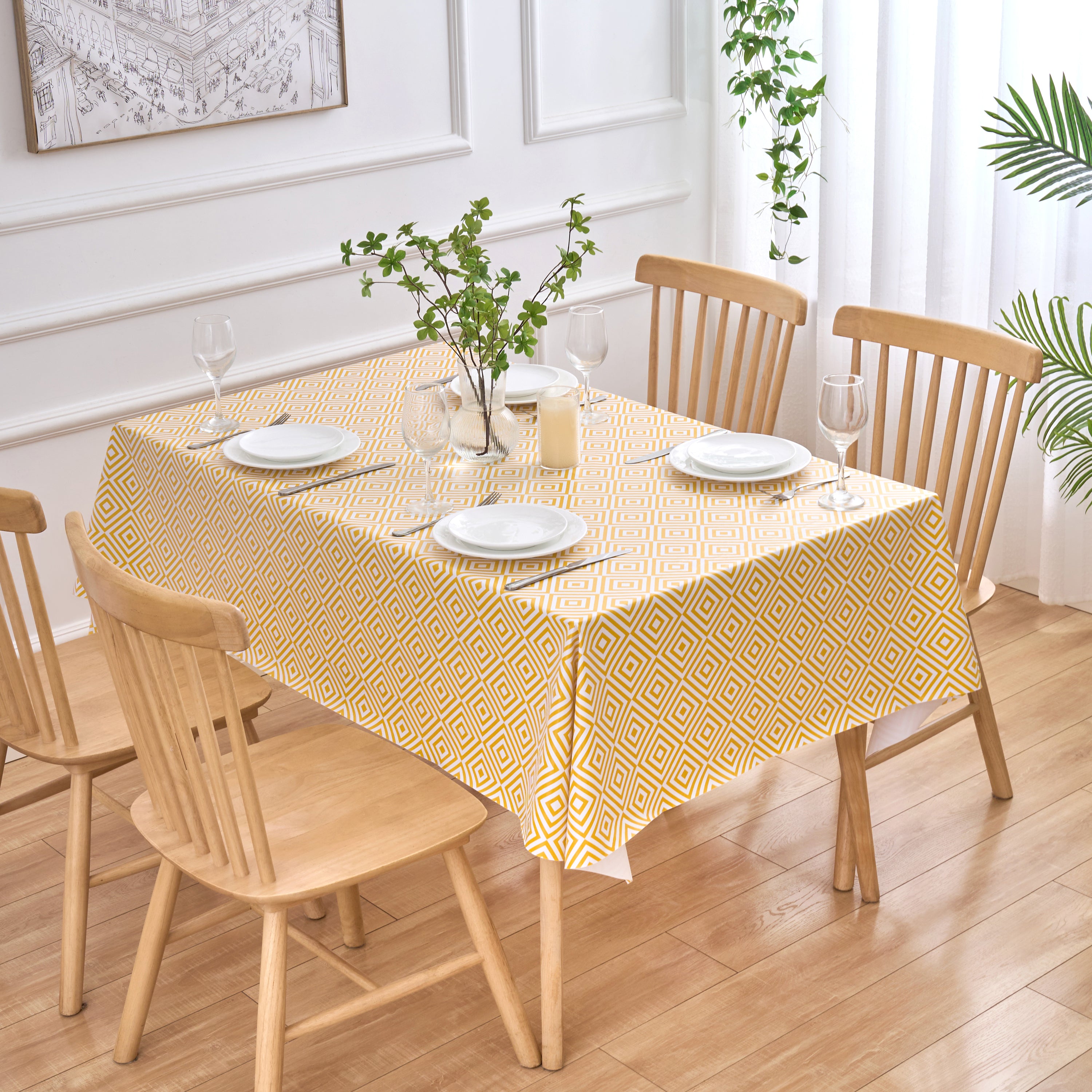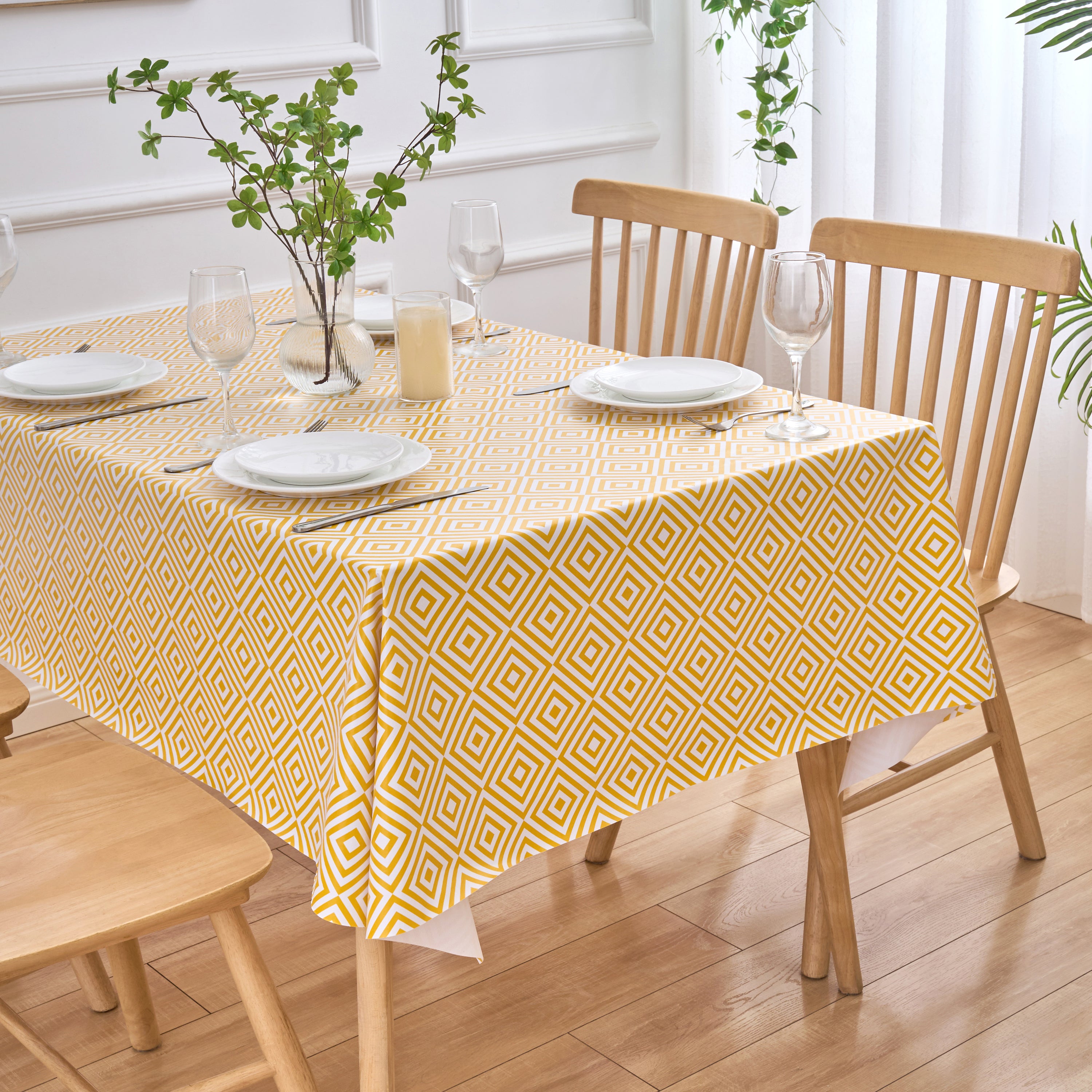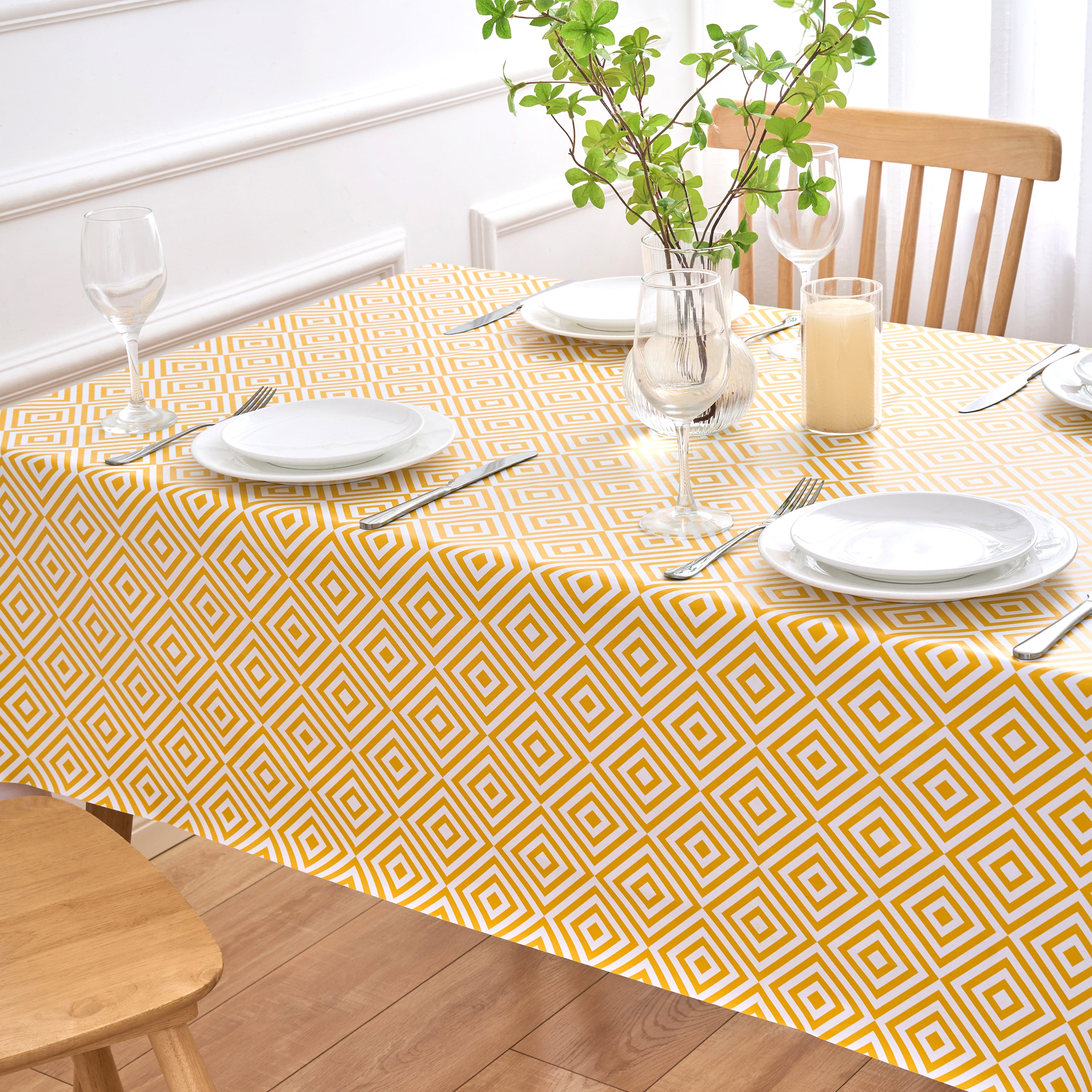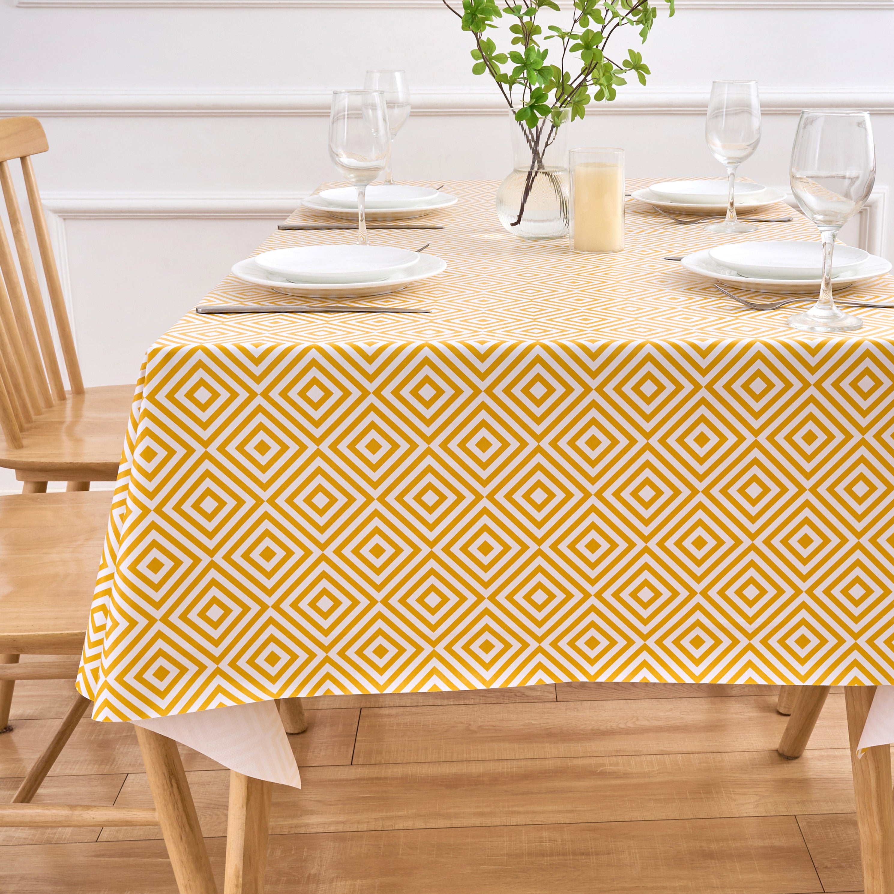 Our contemporary Geo Diamond PVC table cloths with modern ochre and white geometric print design are the perfect combination of stylish living and chic practicality. A bright and uplifting table cover to protect your kitchen, dining or outdoor table, and the smooth soft sheen PVC surface is wipeable, waterproof and very durable.