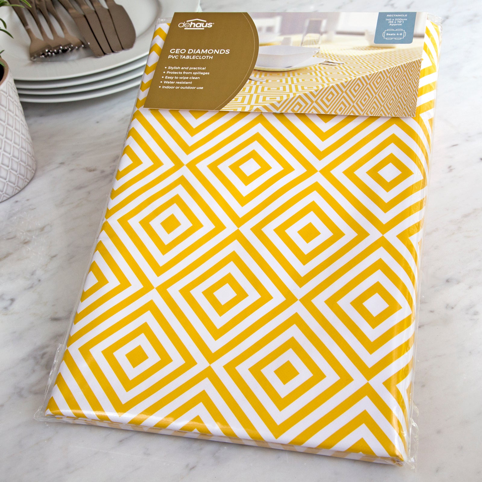 MODERN & PRACTICAL – Stylish on-trend protective table covering by Dehaus with a smart contemporary ochre and white geometric pattern design that will add some instant style and chic to your home, café or restaurant. Grey and white version also available.