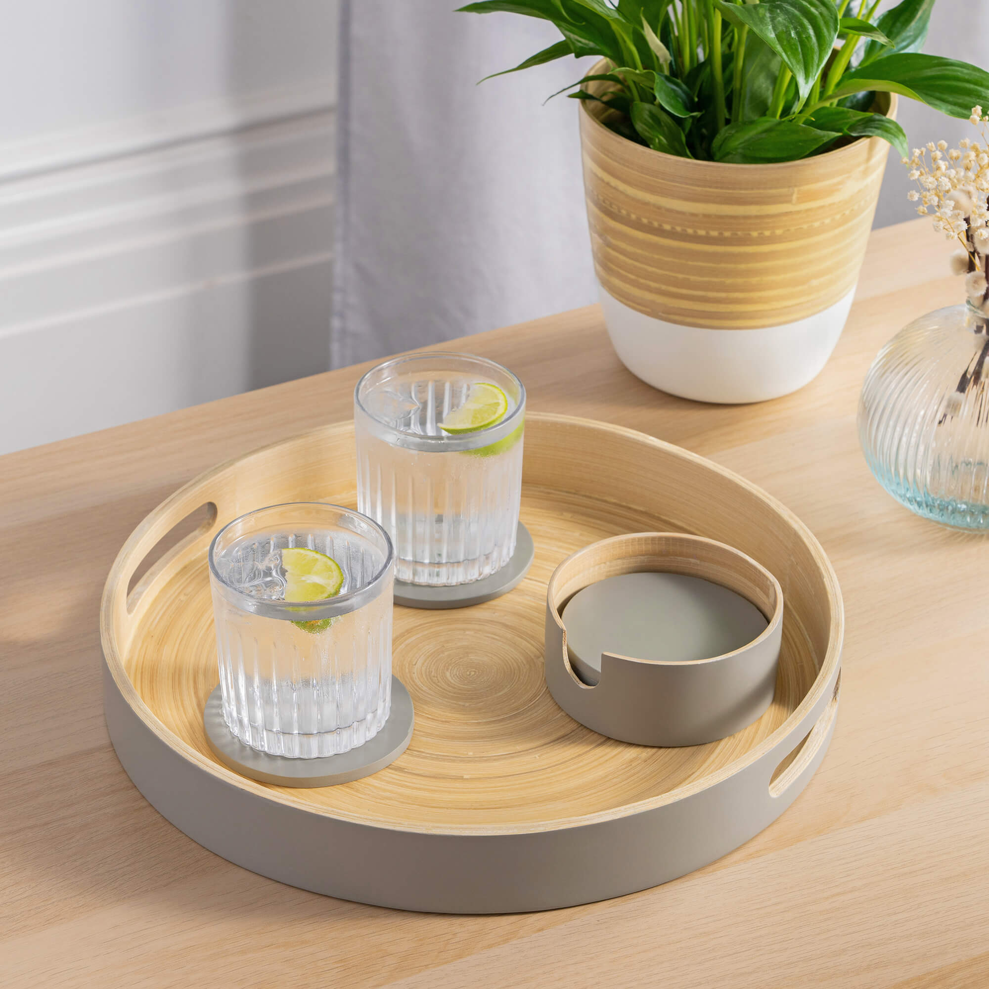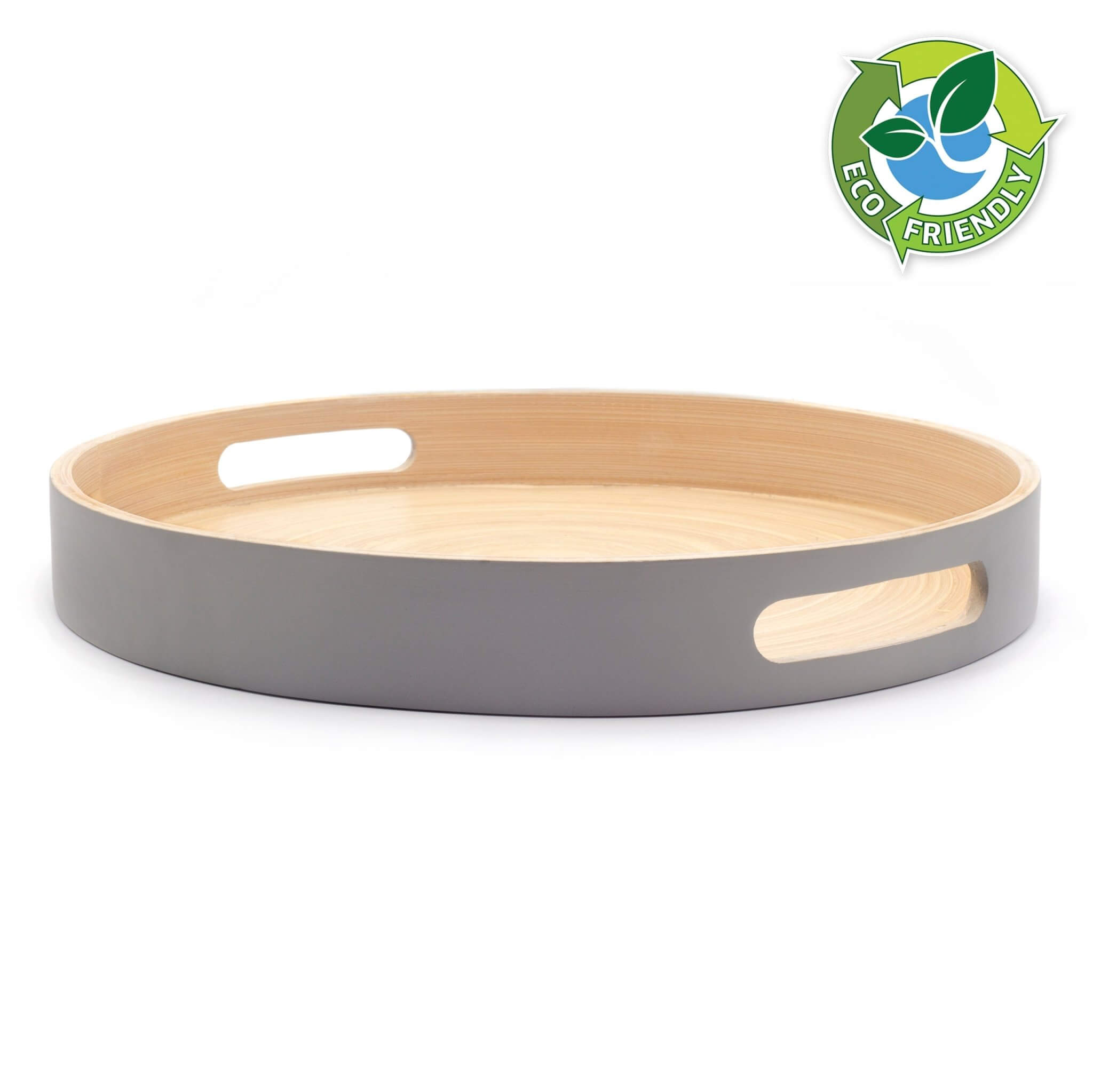 Dehaus Large Round Bamboo Wooden Tray With Handles - Grey