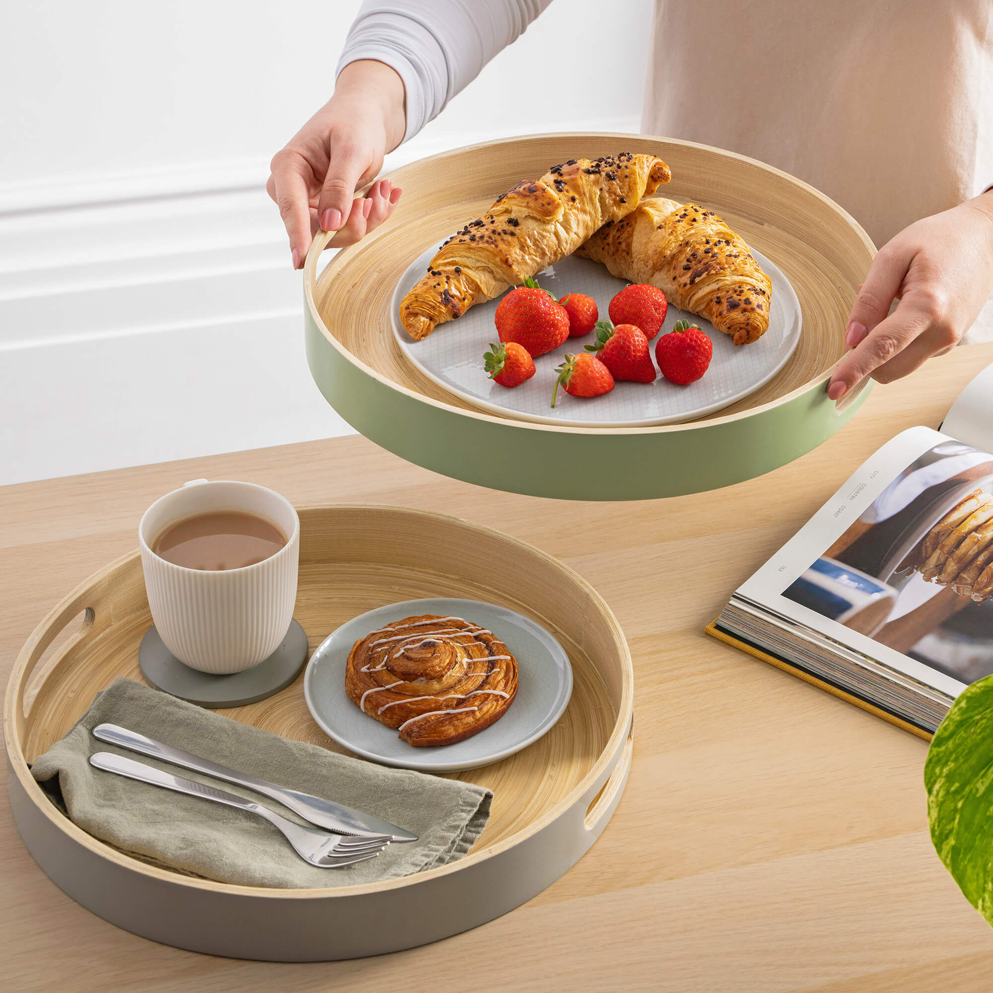 STYLISH MODERN DESIGN – Beautifully crafted by hand exclusively for Dehaus, our large bamboo trays have a contemporary circular shape, two good-sized handle holes, and a lovely soft satin paint finish. Available in Grey or Sage Green.